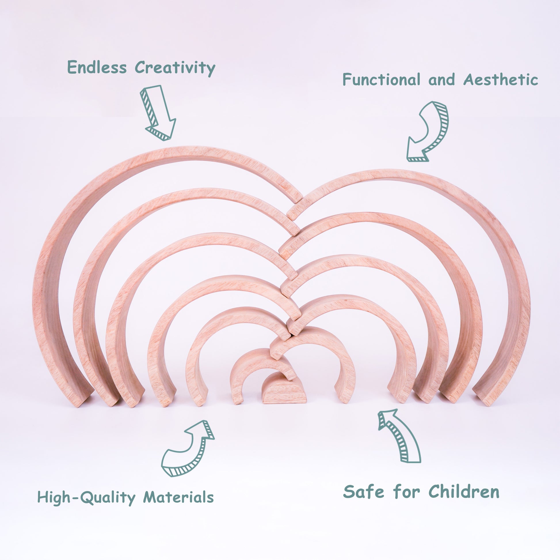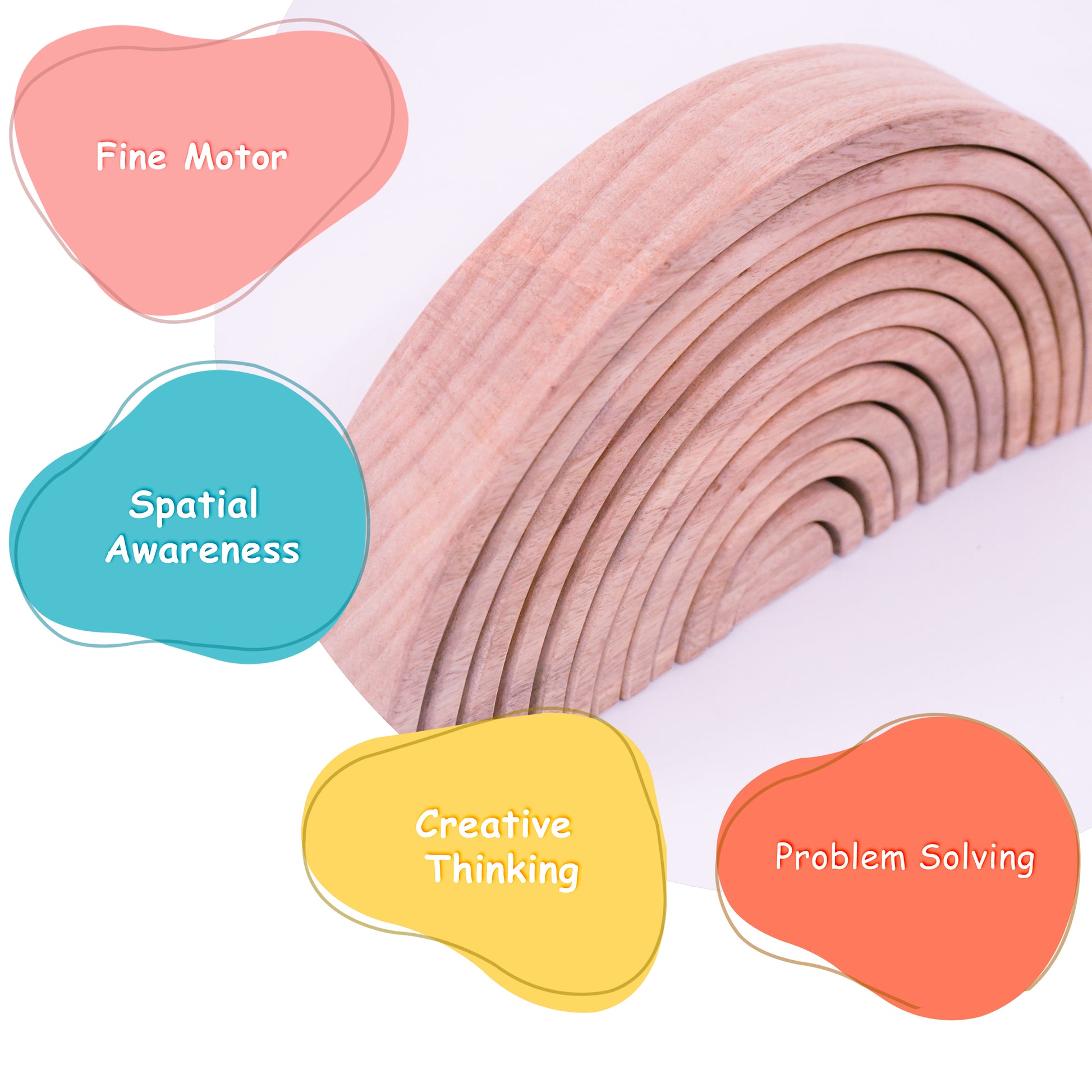 The wooden rainbow arch stacker toy consists of smooth, colorful arches that can be stacked, balanced, and arranged in countless ways. Children can build tunnels, bridges, towers, or imaginative landscapes, enhancing their fine motor skills, problem-solving abilities, and spatial awareness. Whether used as a Montessori wooden rainbow stacker for learning or as a decorative element in a nursery, it’s a perfect blend of play and aesthetics.