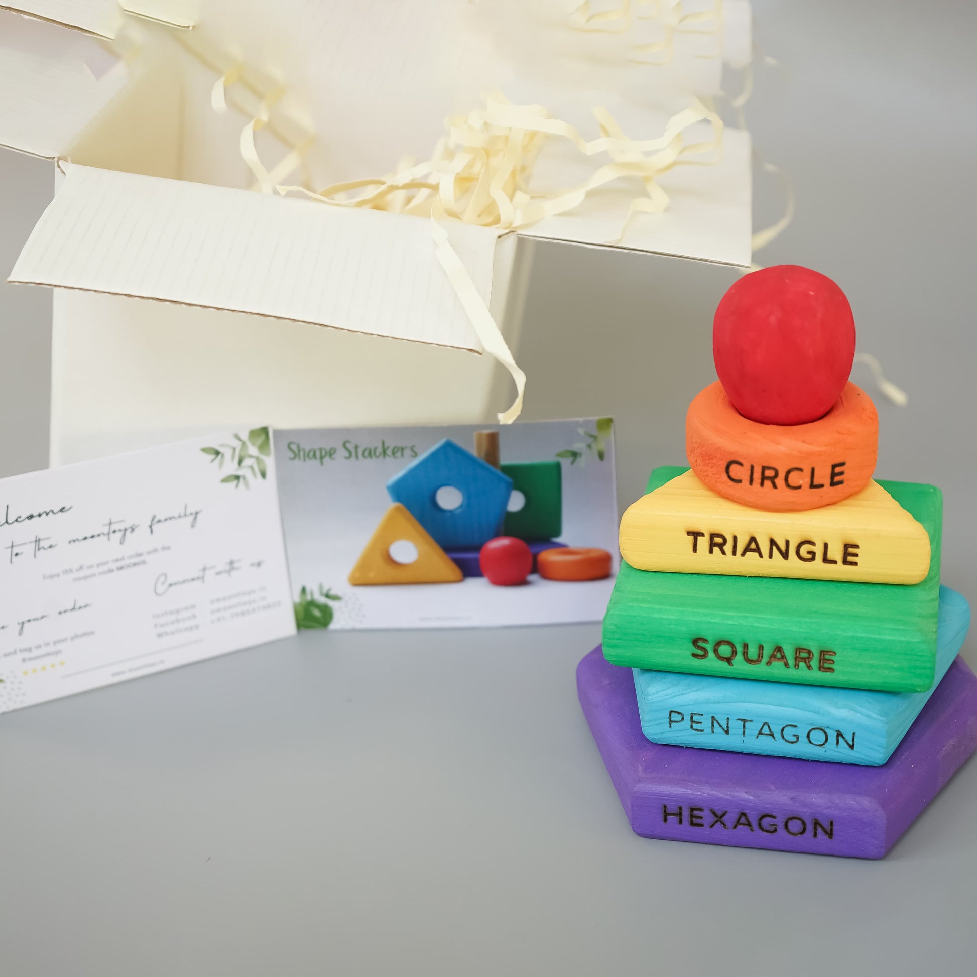 Indulge in the vibrant world of shapes and colours with our Rainbow Wooden Stacker Toys. Every piece is beautifully crafted from organic wood and the set features shapes like circle, triangle, hexagon, oval, pentagon and square, with their names engraved on their respective shapes. In a spectrum of safe colours—purple, blue, green, orange, red and yellow—this set boasts a clean finish promoting safe play in the gentle hands of your children. It is perfect for solo or group activities and encourages learning and fun.