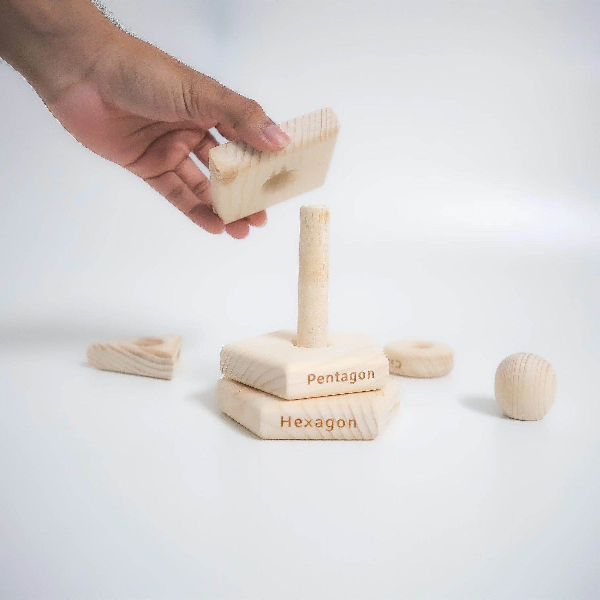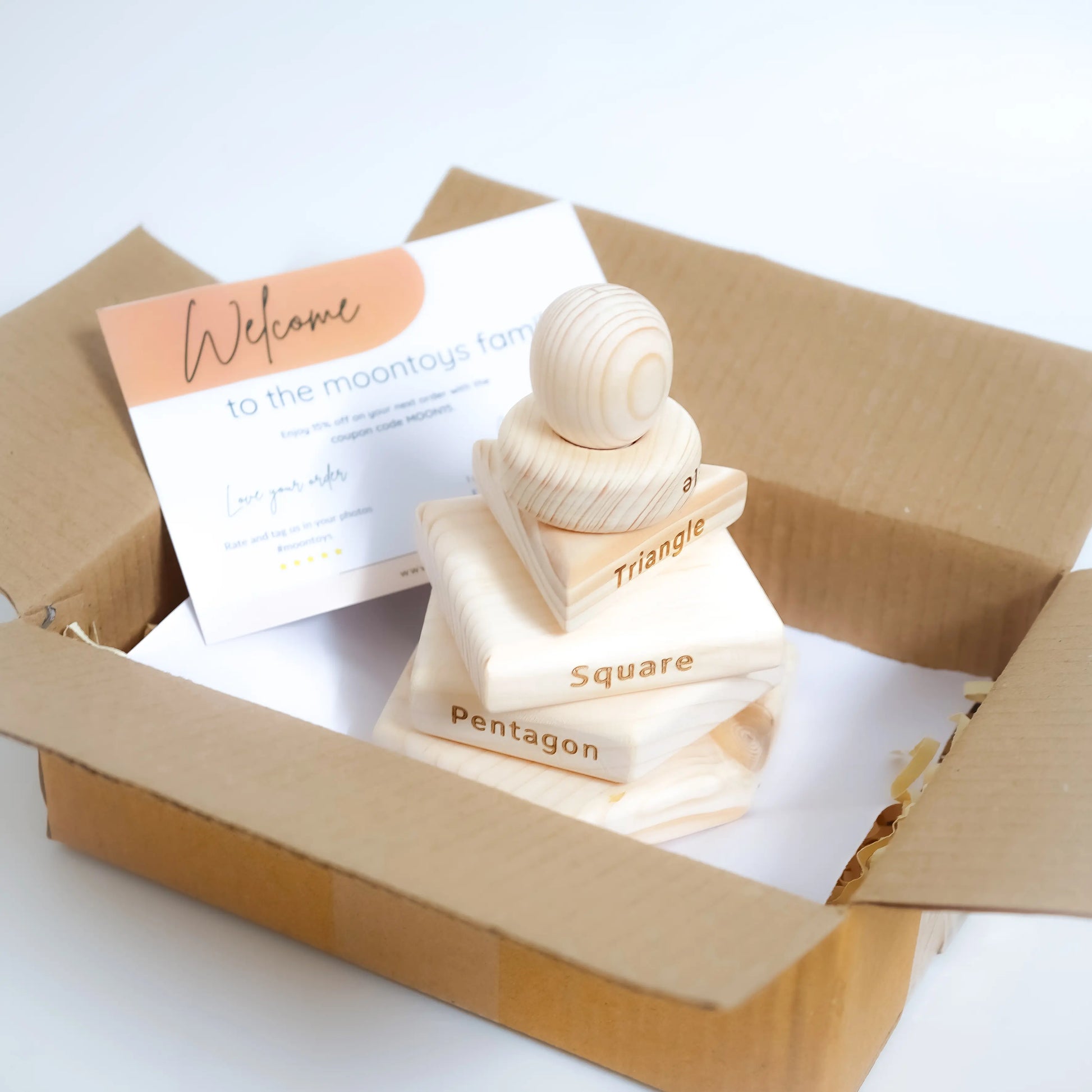 Introduce your child to the exciting world of shapes with our Wooden Shape Stacker Toys for Toddlers. Thoughtfully designed to combine fun with learning, this Montessori Wooden Shape Stacking Toy Set is perfect for little hands exploring new skills. Each piece is made from smooth, natural wood and shaped into familiar geometric forms like circle, triangle, square, oval, pentagon, and hexagon. The blocks also feature engraved names, making it easier for children to associate shapes with words during playtime.